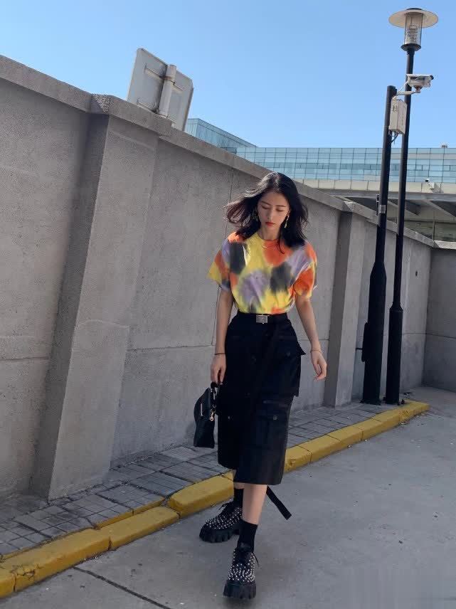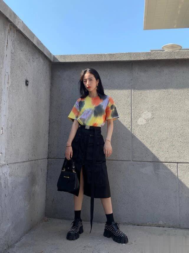 周雨彤的这款半身裙属于工装风,裙摆采用不规则开叉设计,增添了时尚感,比一般款式更具吸引力,还能若隐若现地秀出小细腿。T恤搭配工装半身裙帅气时髦,鞋子可选择同样风格的黑色厚底鞋,不仅有很好的增高效果,铆钉装饰也很有时尚感,让整体造型不那么沉闷。