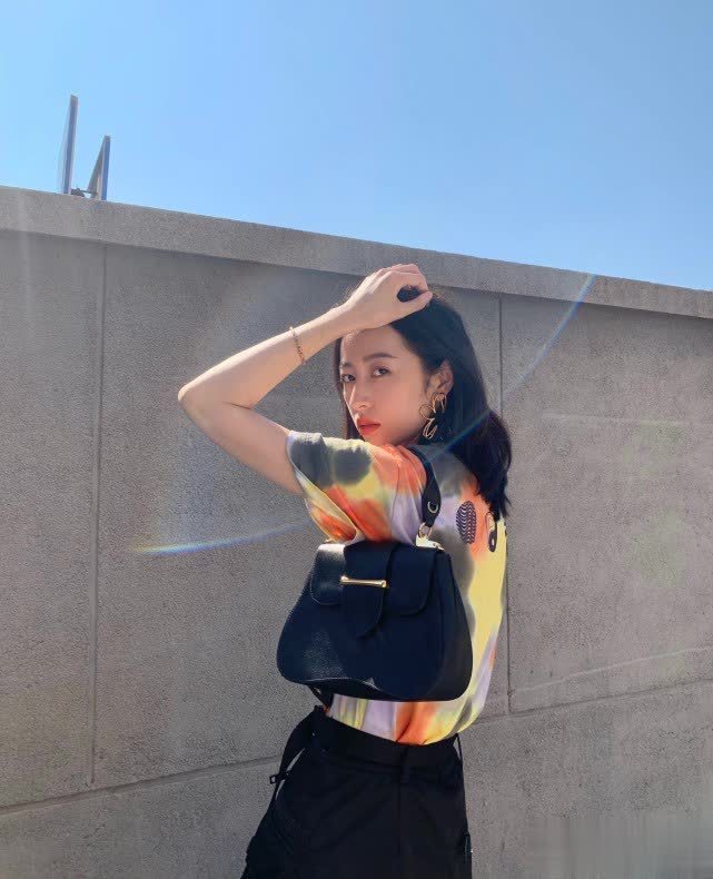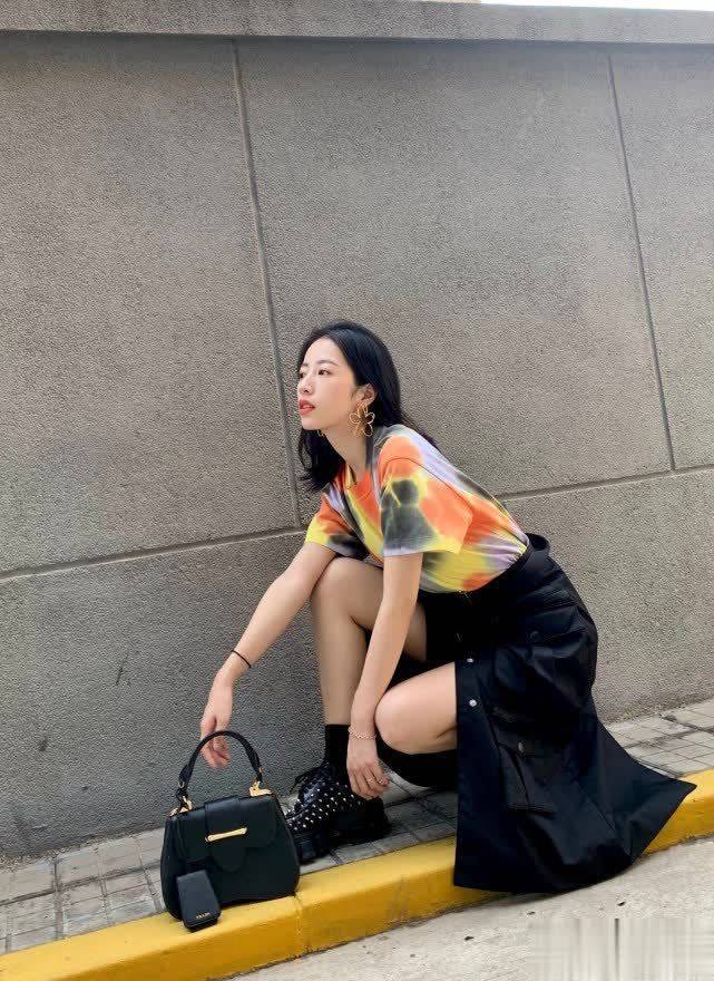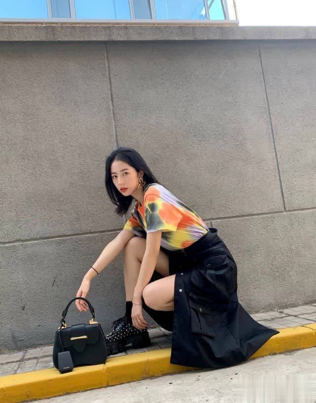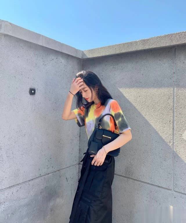 相较于常见的黑白T恤,周雨彤的扎染T恤酷感十足,潮流吸睛,充分彰显了90后女生的个性。扎染T恤充满青春活力,非常适合春天穿着,搭配牛仔裤或半身裙都不会出错,简约却不失时尚感。周雨彤选择搭配黑色半身裙,更显身材高挑纤细,洋溢着年轻的气息。