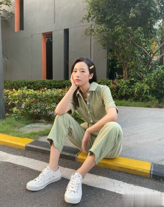 绿色充满生机与活力,特别契合春天的氛围,有着生机勃勃的气息,同时还有很好的显白效果。穿上绿色连体裤的周雨彤显得肤色白皙,身材格外纤瘦,与小白鞋搭配休闲随性。
